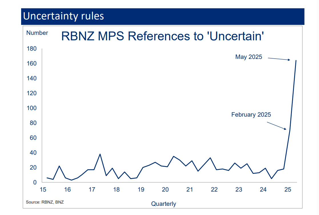 Stephen Toplis, head of market research at BNZ, counted 164 uses of the word “uncertain” in the 50-page Monetary Policy Statement—enough to create a hockey stick-shaped graph.