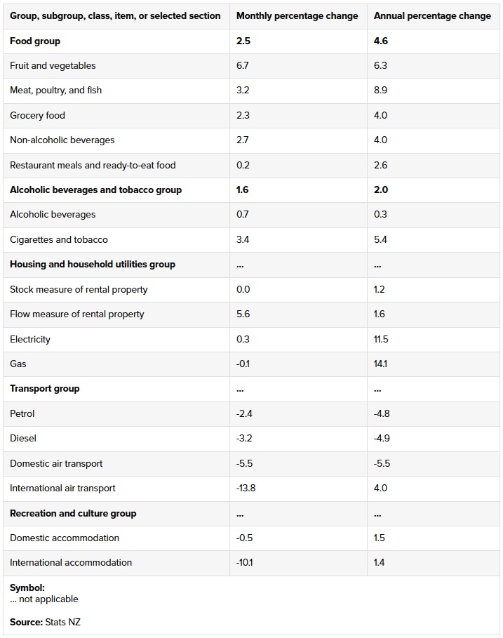 In terms of the annual 4.6% food price increase, Stats NZ said higher prices for the grocery food group, up 4.0%, contributed the most to the annual increase. This was followed by meat, poultry, and fish, up 8.9% annually.