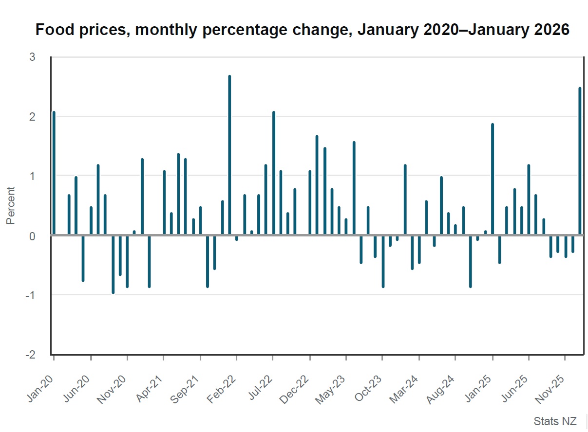 Statistics NZ says all food subgroups increased from December 2025 to January 2026.
