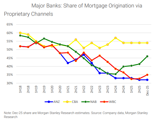 "This reflects our view on several key industry trends: (1) Westpac and ANZ are attempting to arrest a long period of market share loss; (2) CBA's competitors are reinvesting to reinvigorate their proprietary mortgage distribution, and none of the major banks have indicated they are prepared to accept mortgage growth materially below system for sustained periods; (3) third-party brokers will remain customers' preferred distribution channel for new mortgages; (4) major banks will invest more in deposit-gathering capabilities; (5) customers will look for better rates on savings accounts; and (6) Macquarie recently stated that 'over a long time now, we’ve demonstrated our ability to fund our home loan growth with deposits, and we’re confident that we can continue to do so,' suggesting it will continue to price competitively to win more market share in both mortgages and deposits. We expect the influence of these factors to be more meaningful in 2027 than 2026," Morgan Stanley says.