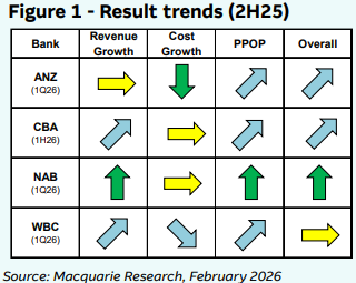 "The February 2026 results across the major banks were better than expected. Revenues were generally better (+0-4%), with costs inline (-3-0%), and bad and doubtful debts below expectations (-20%-47%), driving solid 4%-11% beats to consensus cash earnings. While some temporary factors contributed to better results [such as] seasonally lower expenses and stronger markets incomes, excluding these, results were still ahead of expectations," Macquarie says.