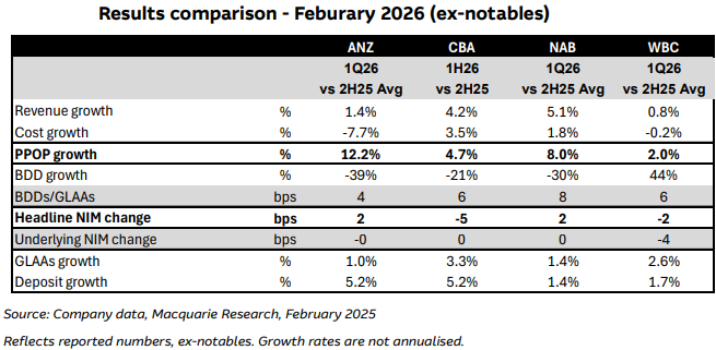 "Compared via a half-on-half basis of December 2025 versus June 2025, excluding notable items, CBA, NAB and Westpac all saw posted consistent pre-provision operating profit trends (+4.5% - 4.7%). While WESTPAC saw weaker underlying margins trends (-5 basis points vs flat) this was offset by better cost management and stronger loan growth."