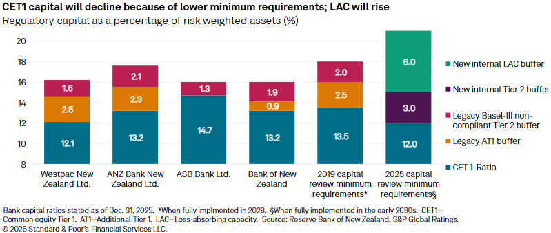 In their place, the RBNZ will require a much thicker layer of internal Tier 2 and LAC instruments, lifting total LAC to a minimum of 21% of RWAs, once fully implemented. These instruments will include nonviability conversion clauses and will be issued internally to Australian parents, ensuring 100% of LAC is group sourced.