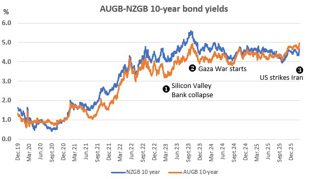 Today (Monday), benchmark NZ Government bond rates are rising sharply. The 10-year is up 10 basis points (bps) from Friday, and rising. The two-year is up 13 bps so far.