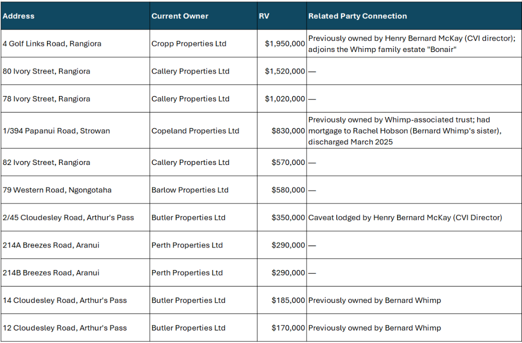 The total rateable value is around $8 million. The court documents reference investor deposits of approximately $45.3 million since 2021. Even allowing for other assets not captured here, the gap between what investors put in and what appears to be securing their investments is a concern. However to be fair to Whimp, CVI claims to have been investing in shares, so significant equity positions may be held in addition to these mortgages.
