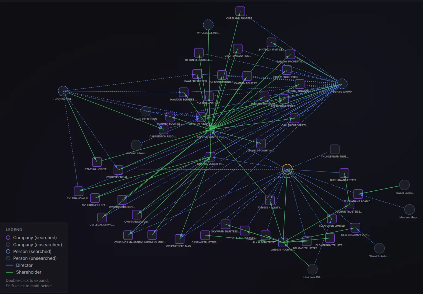 The purple boxes represent companies. The green lines show shareholder relationships. The blue dashed lines show director connections. The CVI network is complex, but here's the thing: this map only shows registered companies. It doesn't include limited partnerships or trust structures, which are notoriously opaque by design. The court documents reference approximately 27 entities in the wider group. The actual beneficial ownership picture is almost certainly more complex still.