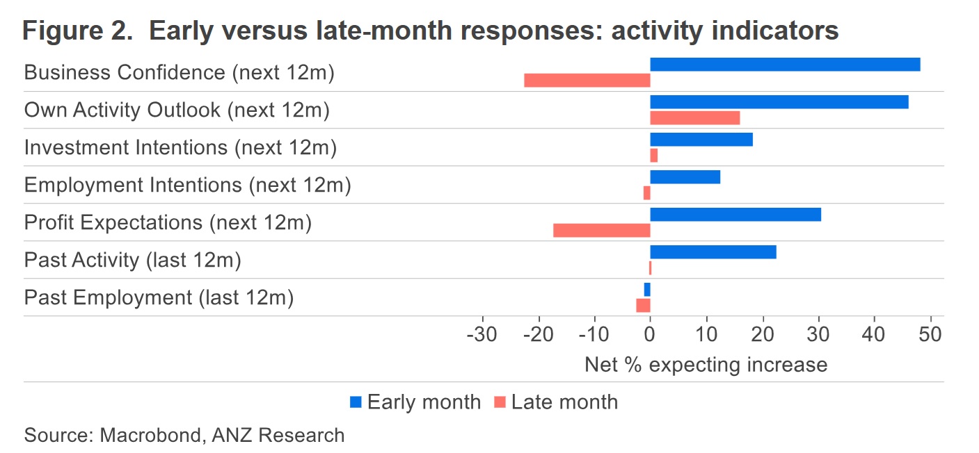 "Nothing surprising there. Of the activity indicators, business confidence (which asks about “general business conditions”) took by far the largest hit over the three weeks in question, while profit expectations also went well negative.