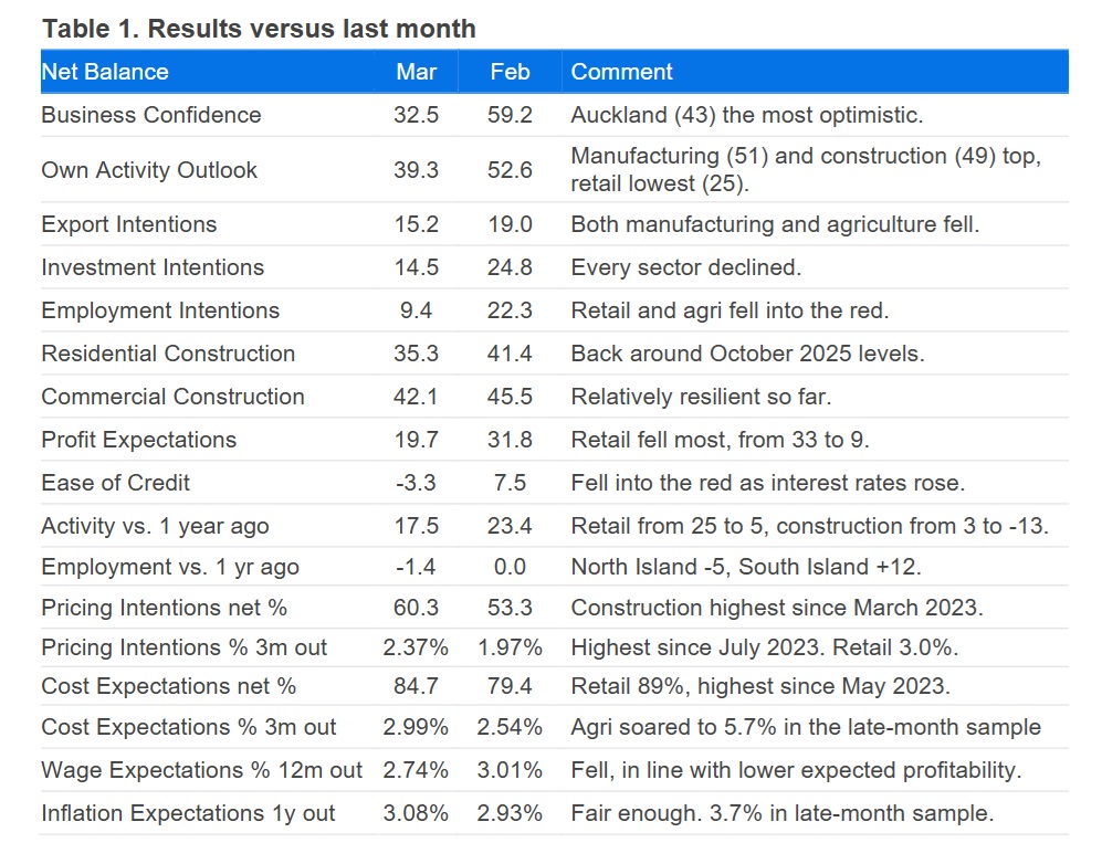 The latest ANZ Business Outlook Survey, which takes in the full month of the Middle East Crisis, has shown a marked deterioration in the confidence of New Zealand businesses, coupled with a surge in inflation expectations.