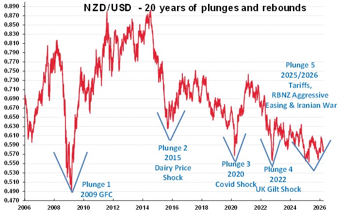 Kiwi dollar plunge number five in the chart below is certainly taking a lot longer to rebound than we originally anticipated last year. The continuing negative interest rate differential to the USD has held the NZ dollar back from making any rapid rebound. The USD appreciation since the war started on 28 February from 97.00 to 100.00 on the Dixy Index has added another reason for the delay in the rebound. However, if “The Donald” is correct in his latest timeline that the war will be over in two or three weeks’ time, the unwinding of long-USD speculative positions in the currency markets entered since the war started, will provide the opportunity for the Kiwi dollar to return to above 0.6000 again.