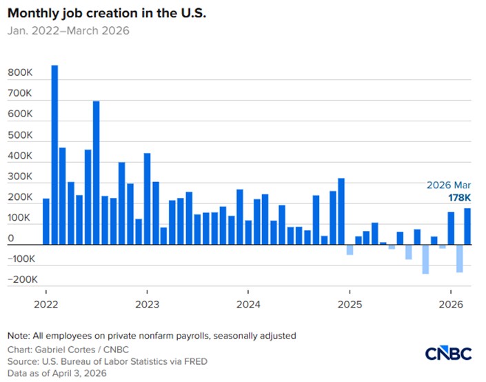 The volatility from month to month in US Non-Farm Payrolls jobs data is becoming something of a standing joke. In March, according to the data, 178,000 new jobs were added in the economy after a 133,000 loss of jobs in the month before in February (refer to the bar chart below). Neither statistic looks to be an accurate measure of what is really going on in the labour market. Over the last 12 months, the monthly job gains have roughly equated to the job losses, as the labour market contracts in both supply and demand. The immigration policies of the Trump regime are partially causing the wild swings, however there is no question of a reduced supply of labour. The unemployment rate, which is calculated from the separate survey of households, reduced from 4.40% to 4.26%, not due to more folk being employment, but from a reduced number of people looking for a job. The participation rate in the labour market reduced to 61.90%, the lowest levels since 2021. If demand was exceeding supply in US employment, wages would be pushed higher. However, that is not the case, with average hourly earnings increasing by 0.20% in March, less than prior consensus forecasts.