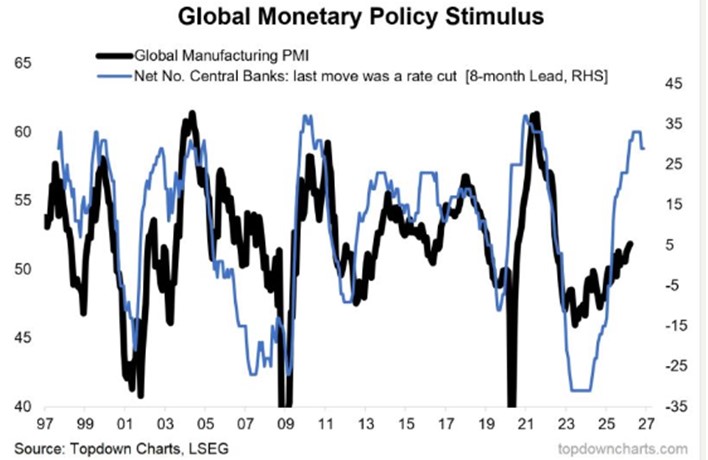 The second chart below (from Topdown charts) is more encouraging for the global economy (post war). Monetary stimulus through interest rate cuts is positive for manufacturing, with further strong gains likely over the coming period – always good news for the NZ economy.