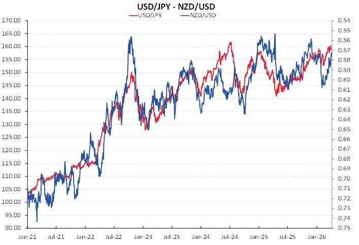 The chart below informs us that the NZD/USD exchange rate is closely correlated to USD/JPY movements. It also tells us that the Yen (red line) has weakened to the 160 level several times before over the last two years and failed to depreciate further. Another turnaround in the Yen back towards 150.00 would allow the NZD/USD exchange rate to return to 0.6000.