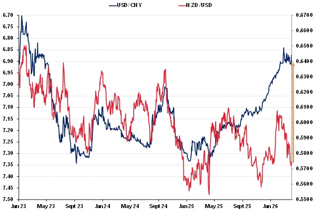 The three cent pull back in the Kiwi dollar from 0.6000 to 0.5700 since the war started, contrasts against the stability of the Yuan (first chart below). The NZD/USD exchange rate has disconnected from the previous close correlation to the USD/CNY rate. As a result of the divergence, the NZD/CNY cross-rate (second chart below) has plunged to previous lows below 4.0000 at 3.9200. The Kiwi dollar has recovered against the Yuan from such lows on previous occasions. It will require independent NZ dollar appreciation based on NZ interest rates rising above those of the US to turn around the NZ dollar’s fortunes and cause a recovery of the NZD/CNY cross-rate.