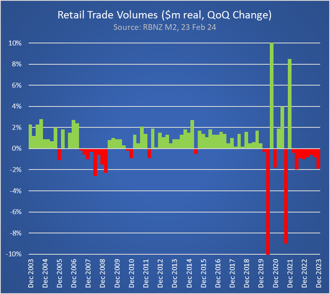 Retail sales volumes shrank in the December quarter and that is the eighth quarter in a row it has declined. But wait, there's more (or, in this case, less). Sales volumes are -4.1% less than a year ago. And if you think that is tough, remember our population is rising at its fastest rate ever. This emphasises the pressures individual households are under and who are trimming real retail spending sharply now. "And looking forward, it’s not clear that this will change significantly over 2024." says the ANZ economists. They and other economists see downside risks to their positive GDP forecasts for Q4-2023 in this data. Q4-2023 GDP outcomes will be released on Wednesday, March 21, 2024, and there is a lot more data than just retail sales that goes into this. But weak consumption is an important indicator.