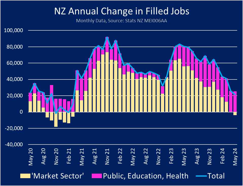 The Ministry of Social Development today released its Benefit Fact Sheets for June 2024. That showed that since this data started being released in 2008, the rise in June 2024 from March 2024 was the most ever for this Q2 period, apart from the first impact of the GFC in 2009 and the first impact of the pandemic in 2020. But of course the employed workforce is still growing, so the ratio isn't moving much. In fact if you include WfF beneficiaries and those on National Super, we still have a stable ratio of 1.85 workers for claiming beneficiaries. That is about the same level we had just prior to the GFC. It has been higher and lower and between.