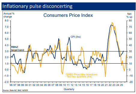 "This level of pricing interest is a big jump from the 7.0% who thought they’d be raising prices a quarter ago and the net 2.1% who indicated prices would be declining a quarter before that. It was also the highest reading since June 2024 and consistent with annual CPI [Consumers Price Index] inflation moving into the top half of the Reserve Bank’s [1% to 3%] target band. To cap things off a net 43% of merchants said they intend raising prices. As it’s merchants that dominate the CPI this is disconcerting," Toplis says.