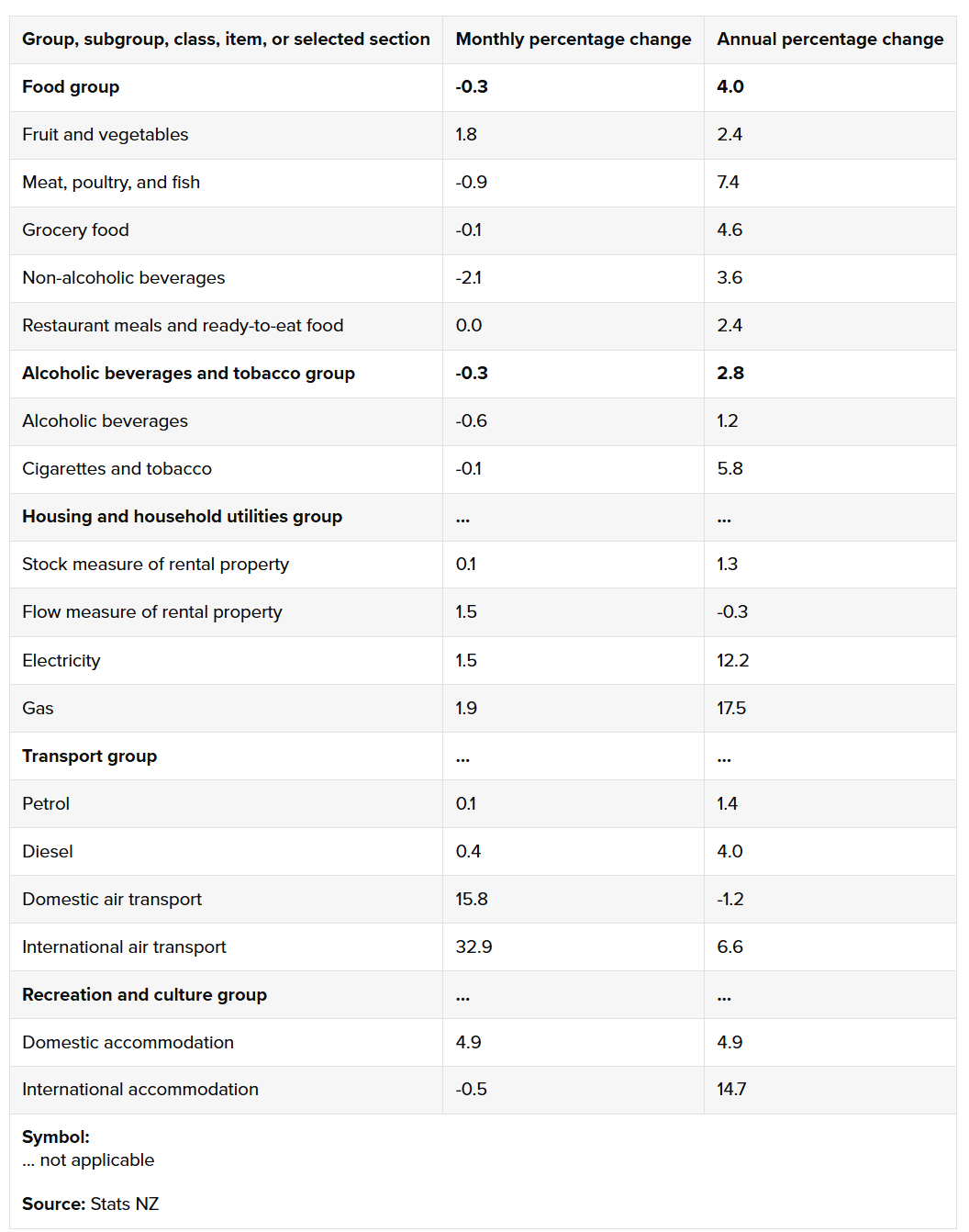 Other major annual increases in the SPI came from electricity which rose 12.2%, gas which was up 17.5%, international air transport which rose 6.6%, domestic accommodation which climbed 4.9%, and international accommodation which jumped 14.7%.