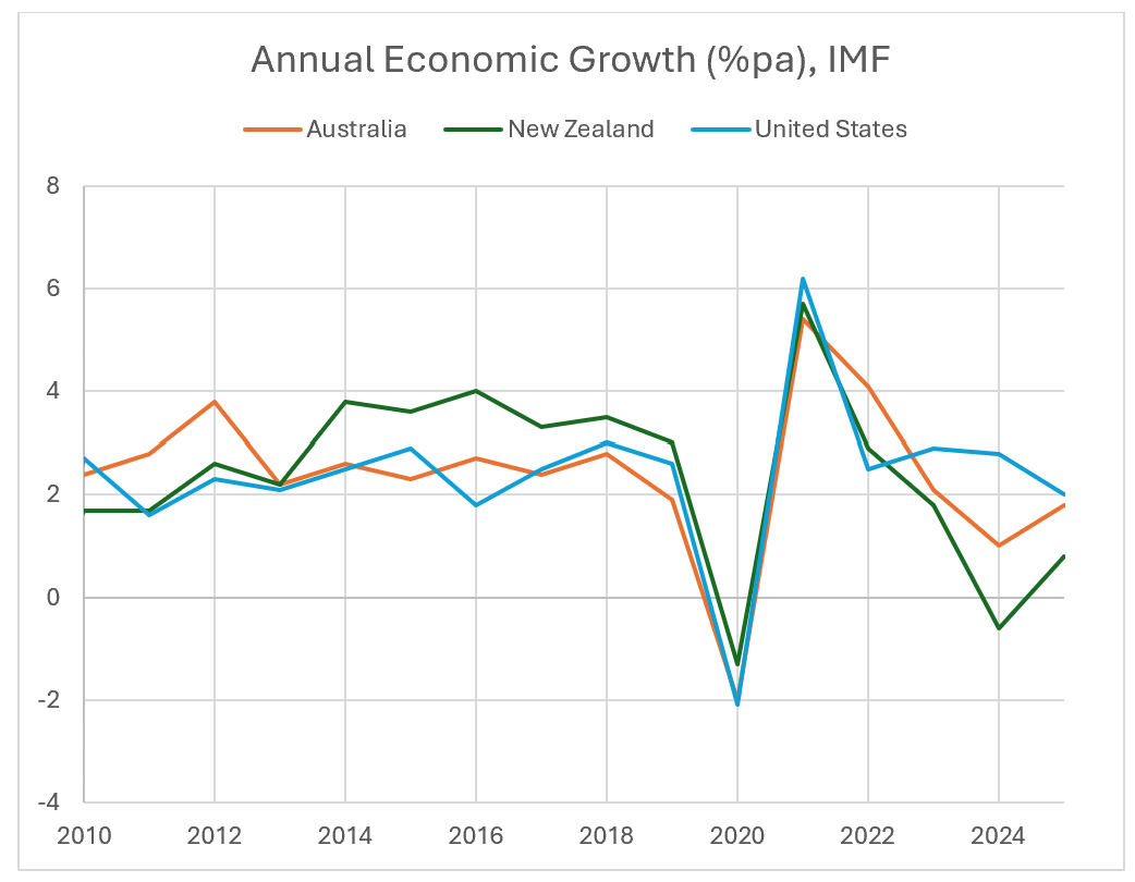 While New Zealand is a very small, remote economy, not directly comparable to Australia, and far from the United States, nevertheless I would like to assess the performance of the Christopher Luxon/Nicola Willis government which came to power in October 2023 with reference to data and charts that also plot the evolution of those other economies, not only over the past three years, but prior to that.