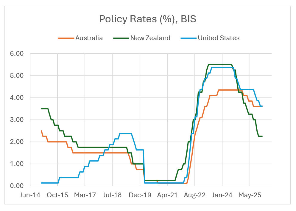 The rapid increase in policy interest rates in New Zealand and the United States, relative to Australia, does not seem to have ended the inflationary shock any faster in those countries than in Australia. In the United States, it does not even seem to have slowed down spending. The recent self-inflicted weakness of the New Zealand economy has certainly helped drive the Official Cash Rate back down.