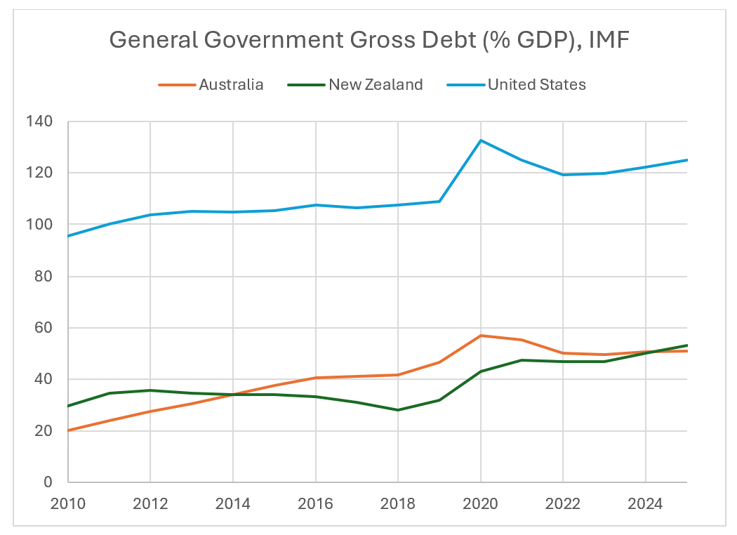It is difficult to see what New Zealand’s government is worried about. New Zealand, like Australia, is a very low government debt economy. People might argue that the US benefits from being the issuer of the global reserve currency, but the figure for Japan is over 200%.