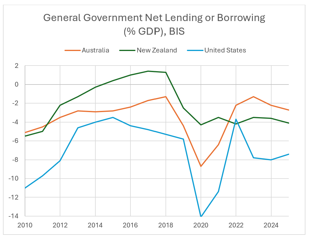 Based on this statistic, the only one of these three economies to run annual government financial surpluses since 2010 in New Zealand. Indeed, it is not normal for currency-issuing governments to run such surpluses, as the private sector has a habitual preference to run financial surpluses, and barring trade surpluses a private-sector surplus requires a public-sector deficit.