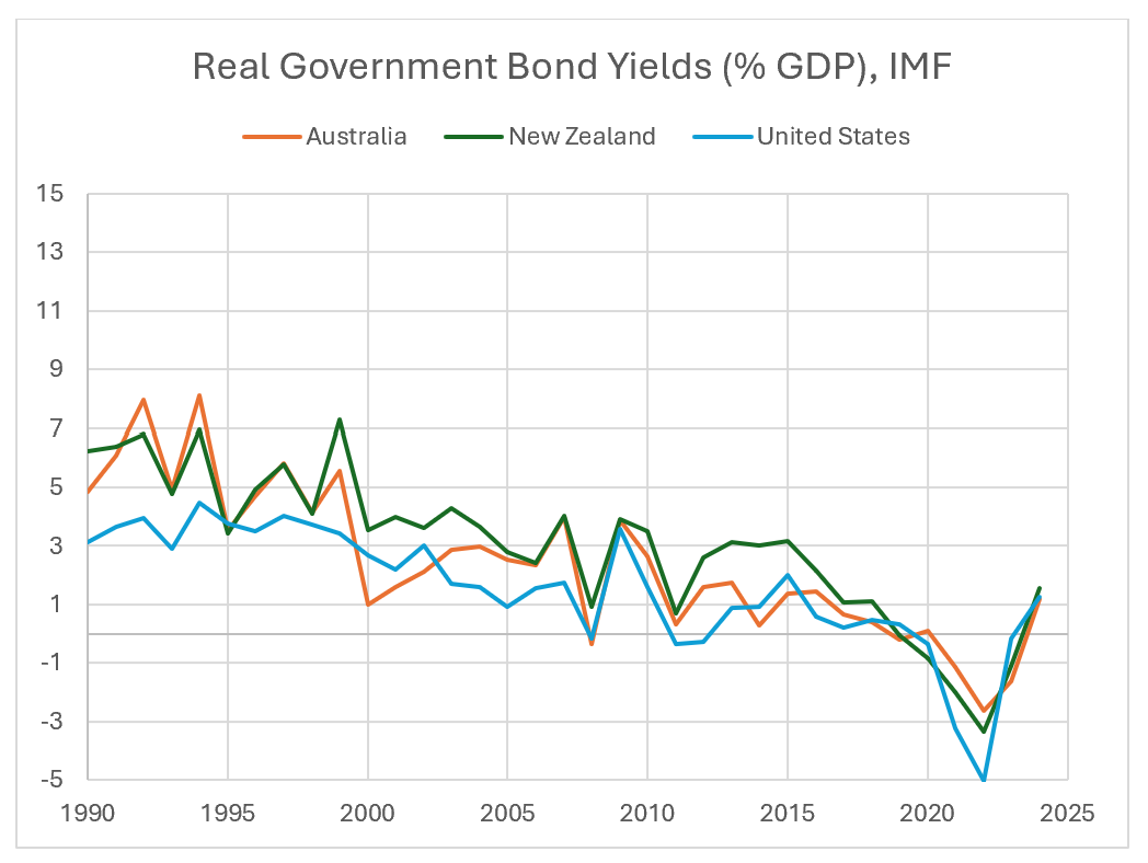 We should address the argument that New Zealand was especially exposed to financial risks during the 1990s due to its government debt. Let’s take a look at the real (inflation-adjusted) interest rate on long-term government debt.