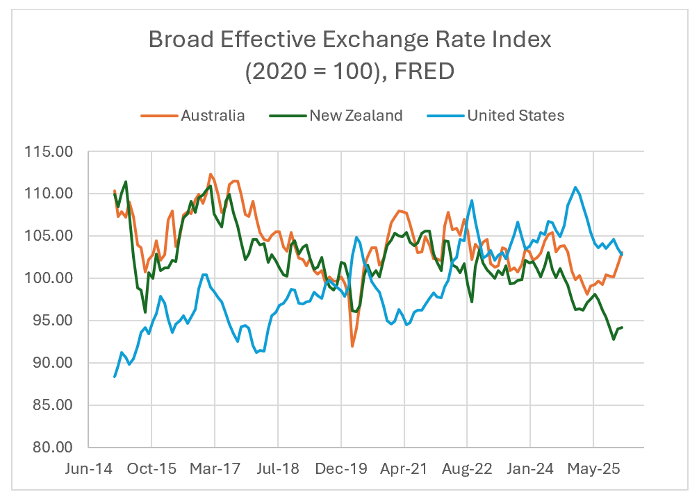 Here we do see a possible source of concern. New Zealand’s current account deficit grew to be significant in 2022. However, the main causes are not a mystery. Tourism earnings had crashed; imported energy prices had surged; and the fact policy interest rates had risen faster in New Zealand than in most other countries helped to raise net income outflows. That this was widely understood and not a source of potential crisis is shown by an examination of the broad effective exchange rate index.