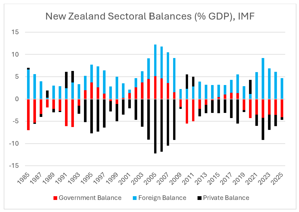 I am a modern monetary theory economist. We like to model the economy using an approach called stock-flow consistent monetary economics. A simple tool within that framework is the (increasingly well-known) sectoral balances chart, pioneered by the British economist Wynne Godley. Here is the chart for New Zealand.