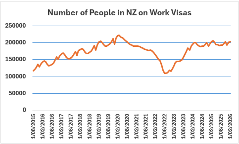 The number of people in New Zealand on work visas appears to be stabilising at around 200,000.