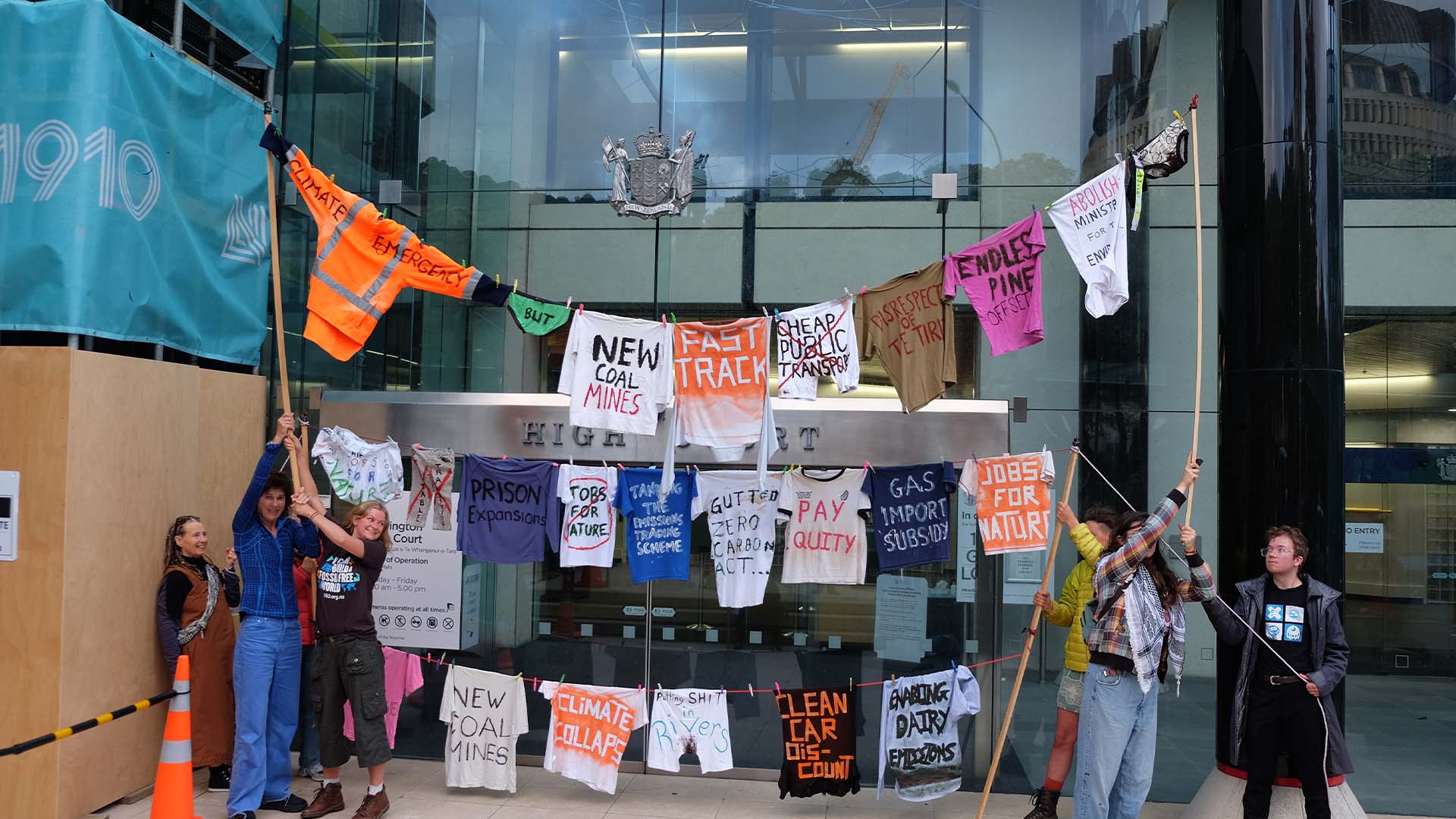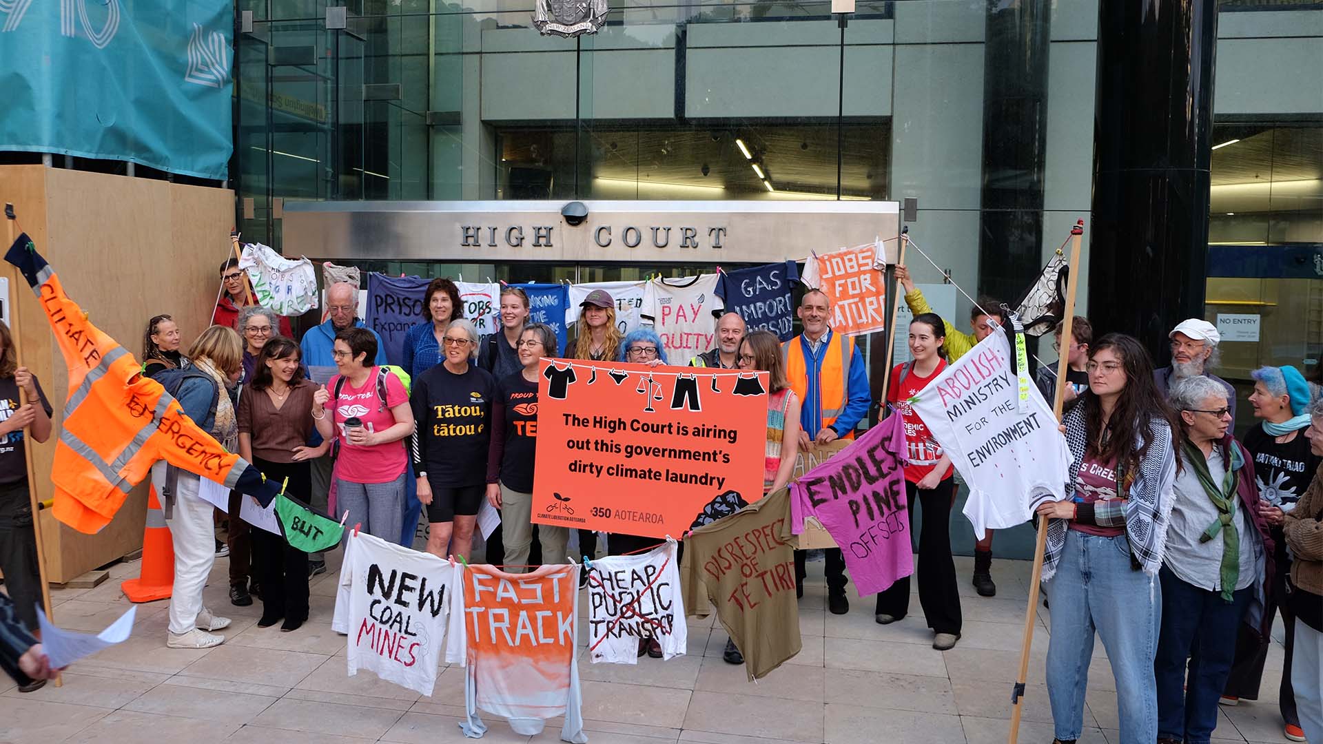 In the lead up to the hearing, there was a protest held by climate activist group 350 Aotearoa, where laundry could be seen. On the laundry, were policies that had been allegedly changed by the Government.