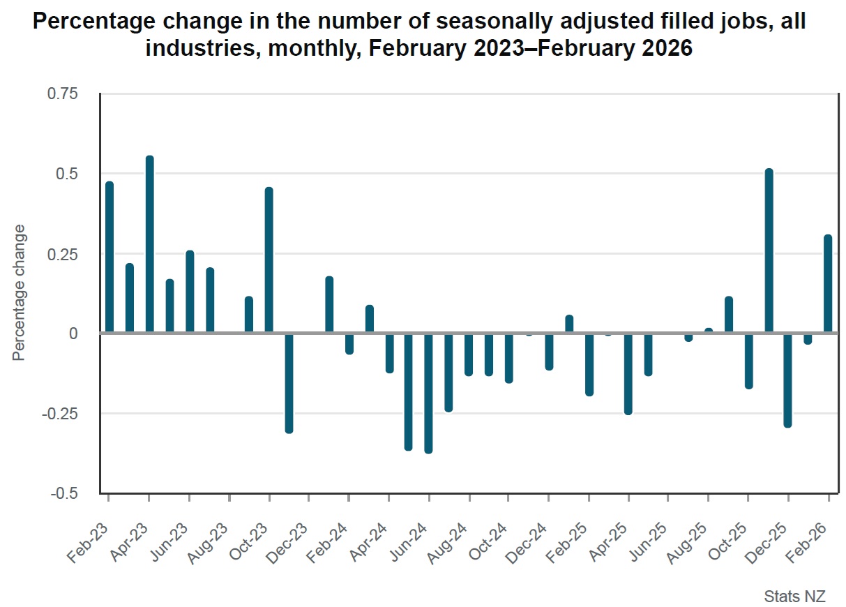 Stats NZ reported in its monthly employment indicators (MEI) that February filled jobs were, on a seasonally adjusted basis, up by just over 0.3% in February (7146 jobs) to 2.35 million.