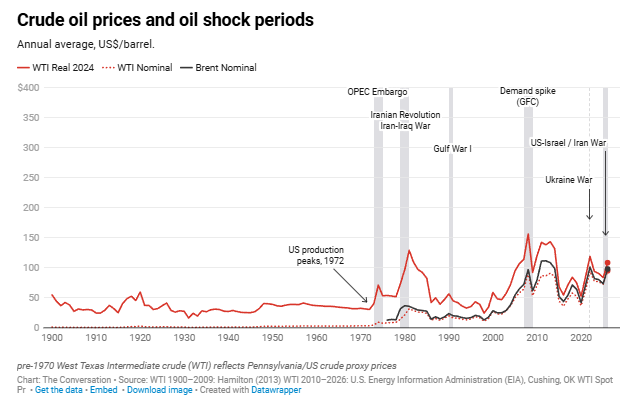 But they’re still elevated. Before war broke out in the Middle East, benchmark oil prices had hovered in the range of US$70–80 a barrel since 2023. That’s near where they’ve sat, on average, in “normal” times for much of the past two decades.