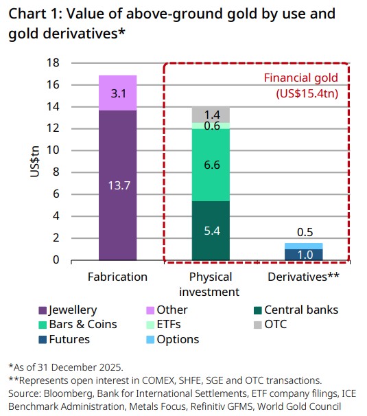 The total investible gold market is worth US$15tn, comprising physical investment (US$14tn) and derivatives (US$1.5tn).
