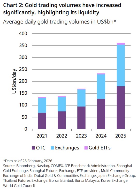 In terms of observable turnover, global gold trading volumes averaged approximately US$361bn per day in 2025 (Chart 2). While OTC trading in London plays a central role (US$180bn/day), other on‑exchange markets are growing in importance (US$174bn/day) to overall liquidity.