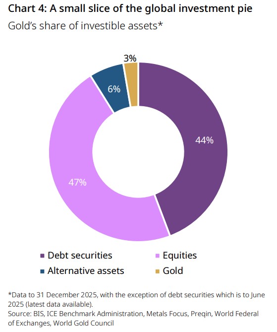 - An under-owned strategic investment: gold makes up 3% of global financial assets (excluding central bank reserves); however, it is not uniformly distributed and remains significantly under‑allocated in many investor portfolios