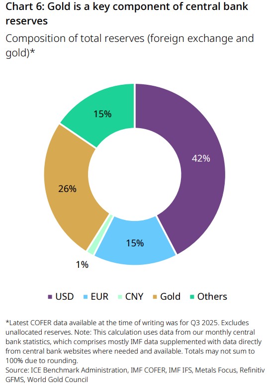 - A core foreign reserve asset: central banks and official institutions collectively hold nearly 39,000t of gold, worth US$5tn, equivalent to 26% of global allocated reserves as of 2025. For developed countries, the average share of gold is larger at 30%, and although emerging markets are catching up, they still hold around 15%