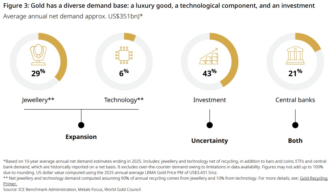 Gold has a diverse demand base spanning consumer use – jewellery (29%) and technology (6%) – and investment use – investment (43%) and central banks (21%) – meaning different drivers can dominate at different points in the economic cycle (Figure 3).11 During periods of economic expansion, pro‑cyclical consumer demand can support gold’s performance. During periods of economic uncertainty, counter‑cyclical investment demand tends to rise and can drive the gold price higher. This framework is a concise way to explain why gold can behave differently from many assets, depending on the macro backdrop.