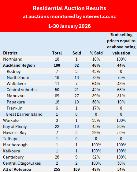 Auction room activity has made a reasonable start to 2026, with interest.co.nz monitoring 255 residential property auctions around the country up until January 30, with 109 of those selling under the hammer.