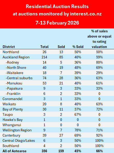 Interest.co.nz monitored the auctions of 356 residential properties over the week of 7-13 February, down from 416 the previous week.