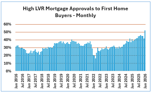 The latest figures from the Reserve Bank show 51.8% of the mortgages approved for first home buyers in January were low equity loans, where the borrower has less than a 20% deposit.