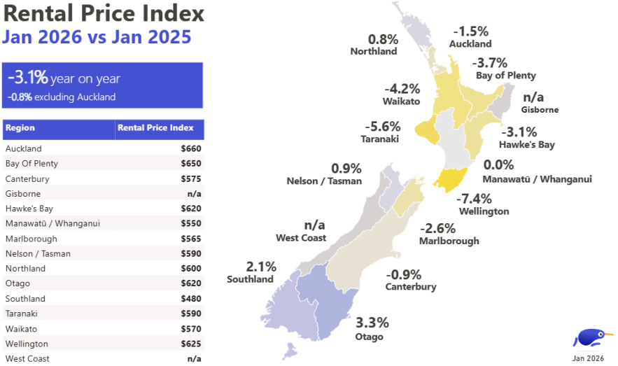 Advertised housing rents were down 3.1% overall in January compared to a year earlier, according to Trade Me Property.
