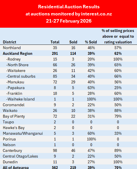 Interest.co.nz monitored the auctions of 562 residential properties around the country over the week of 21-27 February, well up from 427 the previous week. It was the busiest week for auction activity since the final week of November last year.
