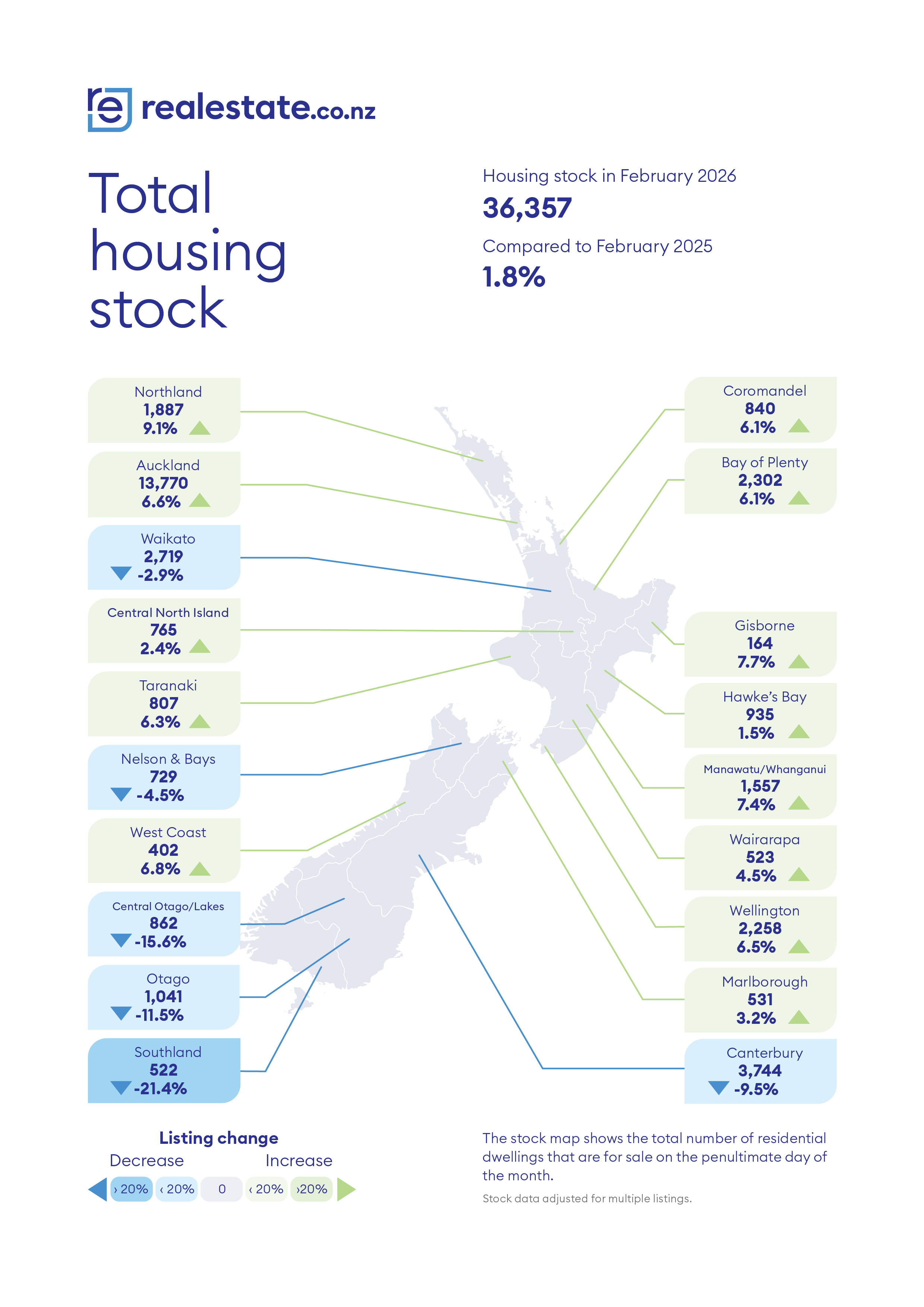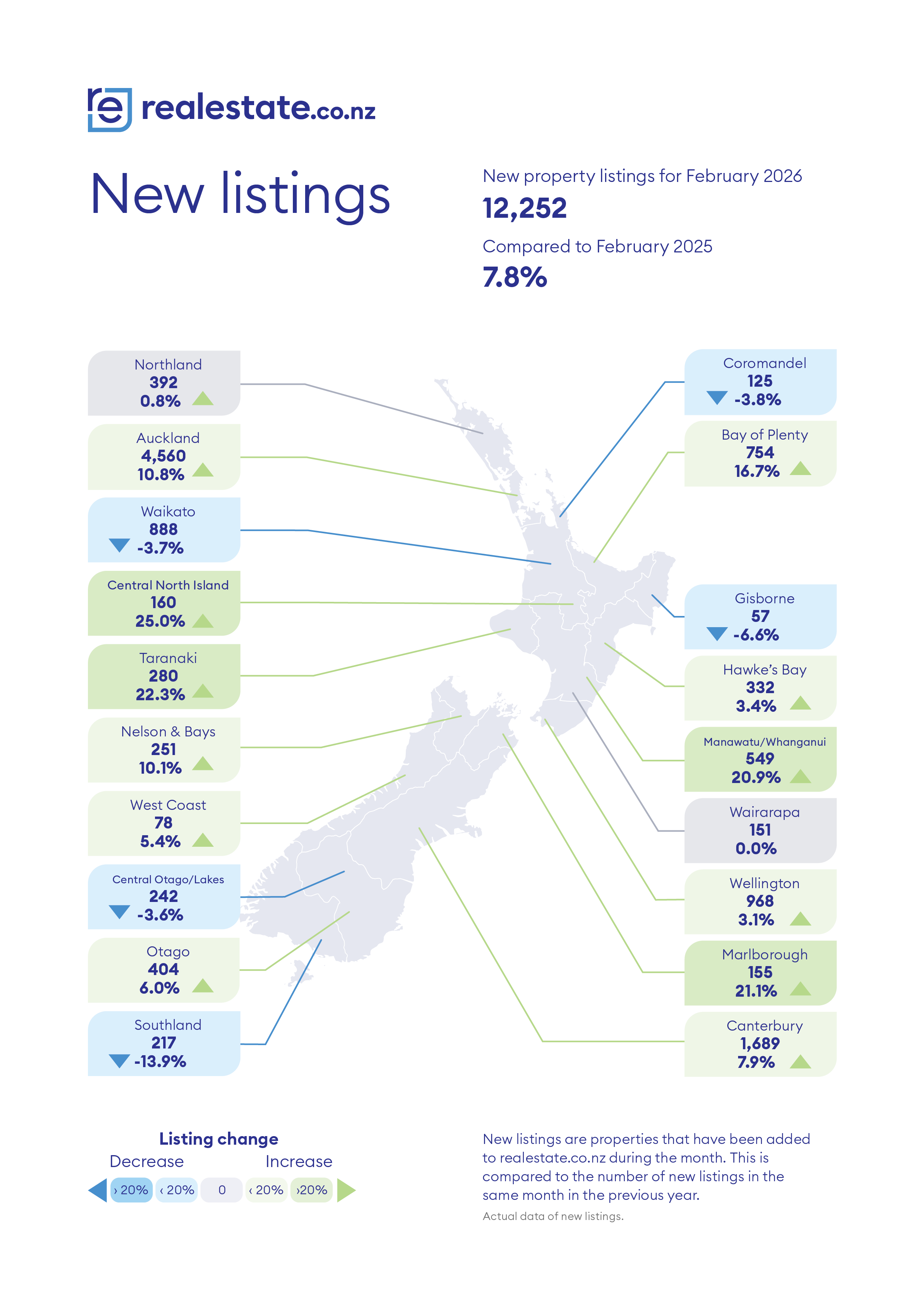 However, buyers in most main centres will also have plenty of choice, with new listings in the Bay of Plenty up 16.7% compared to February last year, followed by Auckland 10.8%, Canterbury 7.9% and Otago 6.0%. See the table below for the full regional figures.