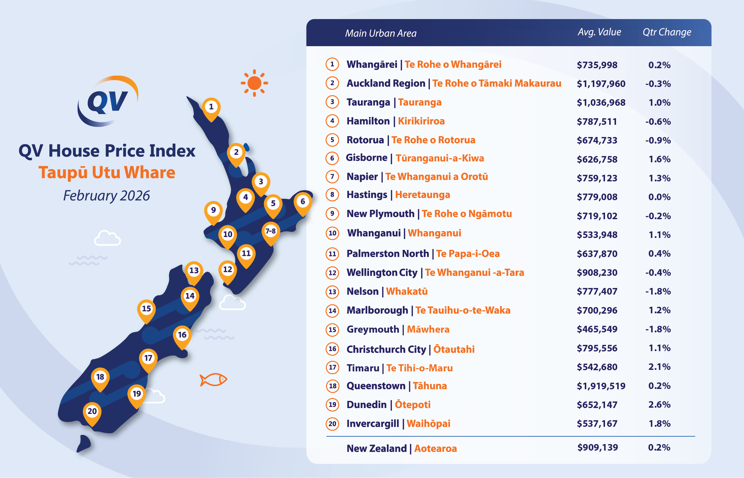 New Zealand's average dwelling value was $909,139 at the end of February, barely changed (+0.2%) over the three months from December, and down 0.4% compared to February last year, according to QV's House Price Index.