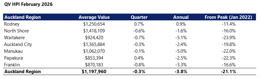 In Auckland the average dwelling value was $1,197,960, down 0.3% over the three months to February, and down 3.8% compared to February last year.
