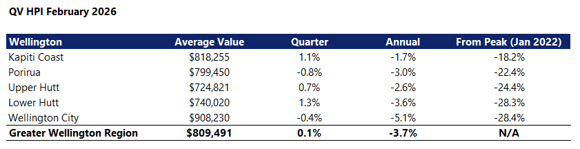In the Wellington Region the average dwelling value was $809,491, up 0.1% over the three months to the end of February, but down 3.7% compared to February last year.
