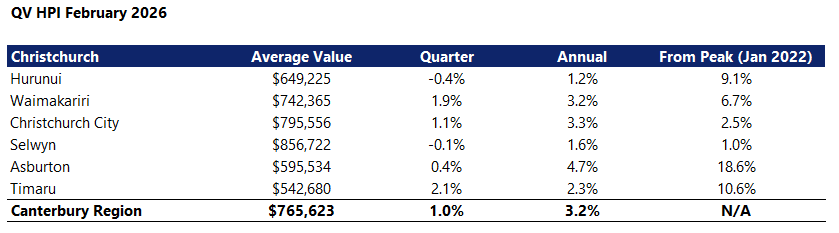 In Canterbury the average dwelling value was $765,623, up 1.0% over the three months to the end of February, and up 3.2% compared to February last year.
