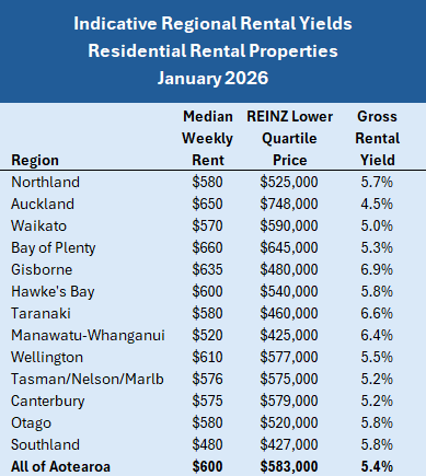 The table below shows the median rents in each region, based on bonds received by Tenancy Services, compared to the REINZ's lower quartile selling price in each region. That enables an indicative gross rental yield to be calculated for each region around the country.
