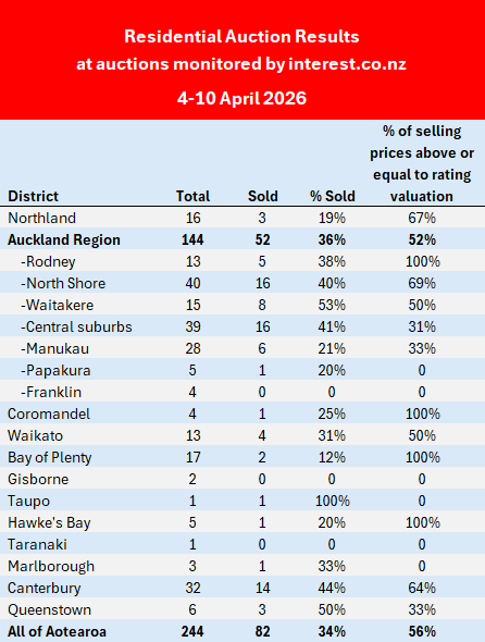 Interest.co.nz monitored the auctions of 244 residential properties around the country over the week of 4-10 April, a decline of 53% compared to the 519 properties auctioned in the previous week (28 March-3 April).
