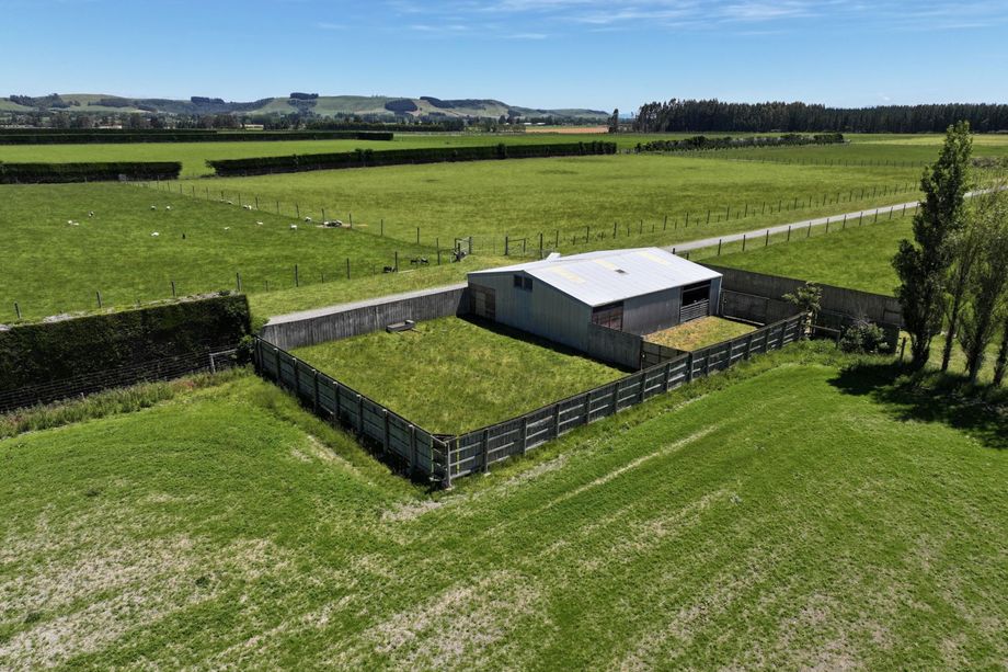 Improvements include a three-bedroom brick and roughcast home with a single garage, along with comprehensive farm infrastructure: a three-stand shearing shed with a 1,000-head covered night pen, deer and cattle handling yards, concrete silage bunker, seven-bay hay shed, three-bay lock-up garage, and a three-bay implement shed.